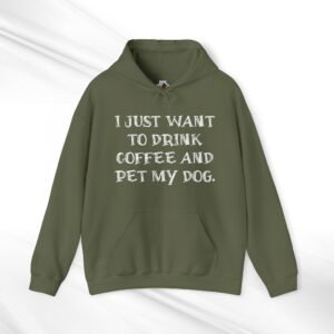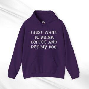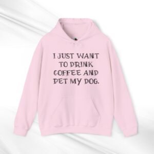 For those days when your furry friend is your preferred company, our ‘Coffee & Canines Hoodie’ speaks volumes without saying a word. Crafted for comfort and a statement, this hoodie features a bold declaration: “I JUST WANT TO DRINK COFFEE AND PET MY DOG.”