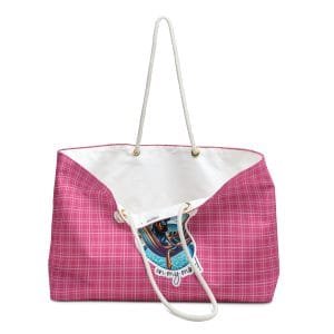 Make a statement with our Sunshine Doberman Weekender Bag. This oversized pink canvas tote is perfect for weekends at the beach or in town, combining style and functionality for all your travel needs.
