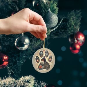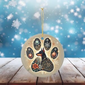 Deck the paws with boughs of badassery. This ceramic Christmas ornament isn’t just festive—it’s a full-on tribute to your Doberman devotion. Designed in the shape of a glowing paw print and centered around a regal Dobie silhouette wrapped in holiday magic, this piece brings bold breed pride to any tree, wreath, or desk plant that needs a little sparkle.
