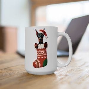 Enhance your holiday beverage experience with our charming Doberman stocking ceramic mug. This cozy 15oz cup showcases a delightful illustration of a Doberman puppy wearing a Santa hat while playfully emerging from a festive red and green Christmas stocking, making it the perfect vessel for your favorite hot beverages during the holiday season.