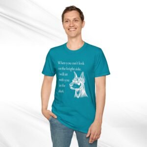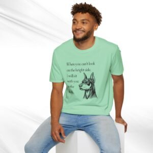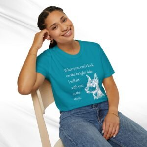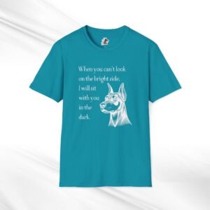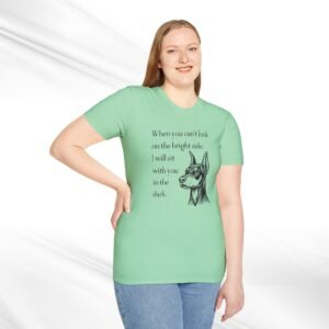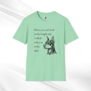 A comforting unisex T-Shirt featuring a doberman quote, “When you can’t look on the bright side, I’ll sit with you in the dark”. This T-Shirt offers a blend of durability, smooth fabric, and comfort, making it perfect for everyday wear. The classic fit and crew neckline provide a versatile style suitable for any occasion, formal or semi-formal. Ideal for individuals seeking comfort and emotional support, this T-Shirt is relevant for occasions when a reassuring message is needed.