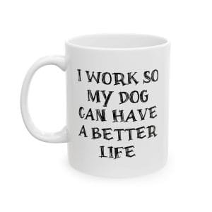 Celebrate your devotion to your four-legged friend with our charming dog lover’s ceramic mug. Featuring a bold, whimsical typography design declaring “I Work So My Dog Can Have A Better Life” – a sentiment that resonates with dedicated pet parents everywhere. Choose from two generous sizes to match your beverage needs: 11oz (325ml), 15oz (444ml).