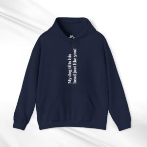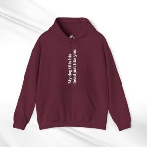 Embrace the hilarity of dog ownership with our “Dog’s Head Tilt Quirky Hoodie,” perfect for days when you and your pup are in tune. This comfy hoodie carries the whimsical message, “My dog tilts his head just like you!” making it a fun addition to any pet lover’s wardrobe.